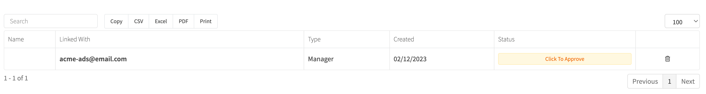 Important: By accepting the invitation as a Sub Account you will grant administrative access to another RevCent user. The only thing the Manager cannot do is create or modify an API when managing your account. Do not grant access to unknown parties or accounts you do not trust. Instead, delete the invitation by clicking the trash icon.